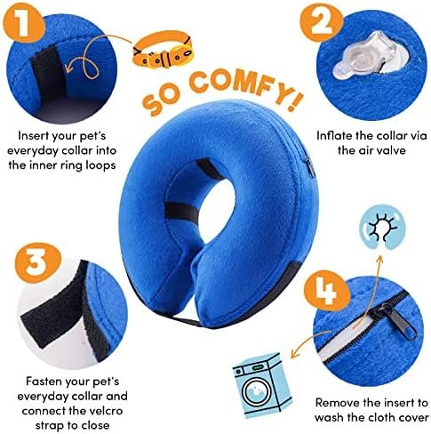 - ADJUSTABLE AND EASY STORING – You can easily adjust the collar strap for a perfect fit and put the strap side at the back of your dog’s neck in case of biting. Deflating and storing is also handy, store it in a small space for space-saving, and there is a zipper opening on one side, you can take the bag out and wash the outside cloth.