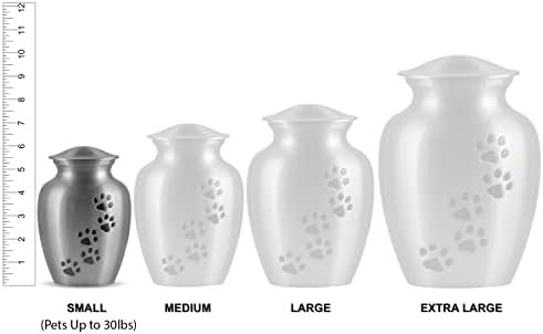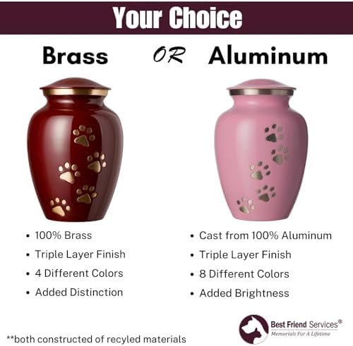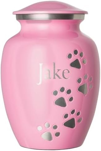 About this item Beautifully Crafted Custom Pet Urn: Remember your beloved pet with a custom Small, Ardent Pink with hand carved Vertical Pewter Paws or choose from a variety of other colors to remember your best friend. This elegant display urn will look great on a mantle shelf nightstand or anywhere you’ll want it to be proudly displayed. The bottom features a felt bottom scratch-resistant padding to protect your furniture and wood finishes. Custom Personalized Engraving: Personalize this premium solid aluminum pet urn with an elegant design through laser engraving. Our dog urns for ashes feature solid hand-carved paw prints and allows for up to three lines of text, with 25 letters per line, enabling you to always remember and cherish your beloved pet. Choose from seven different fonts to create a truly unique tribute that you’ll be proud to display. Handmade Craftsmanship: This pet urn for dogs or cats is meticulously crafted by skilled artisans, employing traditional techniques from start to finish. As each urn is handmade, no two pieces will be exactly identical. Our old-world metal casting experts create these one-of-a-kind pieces, turning them into true works of art. Designed to resist denting or marring easily, and the threaded screw top provides secure protection for your pet’s ashes, guarding against accidents and mishaps. Available Sizes: Our pet memorials are available in various sizes and will accommodate dogs from Chihuahuas to Mastiffs and cats of all sizes during this difficult time – Small 0-25lbs, Med, 31-65lbs, Large 66-110lbs, X-Large 111-170lbs. 100% WORKMANSHIP GURARANTEE: We are dedicated to your support as you transition your loss into memories.