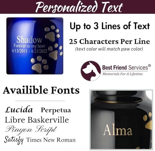 FeatureCustom Personalized Engraving: Personalize this premium solid aluminum pet urn with an elegant design through laser engraving. Our dog urns for ashes feature solid hand-carved paw prints and allows for up to three lines of text, with 25 letters per line, enabling you to always remember and cherish your beloved pet. Choose from seven different fonts to create a truly unique tribute that you’ll be proud to display.
