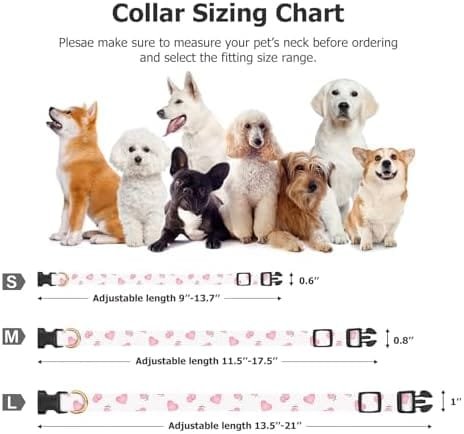 The dog collar,made of double cotton, is considered the optimal choice due to its high quality and non-irritating properties. It is designed to provide comfort for dogs of all sizes with adjustable lengths ranging from 9 ~ 13.7 inches (small), 11.5 ~ 17.5 inches (medium), and 13.5 ~21 inches (large). The widths are available in 0.6(S), 0.8(M), and 1(L) inch.