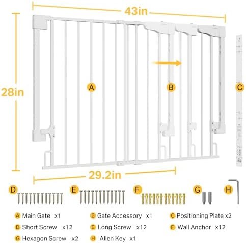 - 【Wide & Adjustable Fit】 Fits openings 29.2–43 inches wide at both top and bottom mounting points. Please measure both points before purchase, considering baseboards and bannister shapes. With an adjustable width, this baby gate fits various doorways, stairways, and hallways, providing flexibility for your home. Ideal for keeping children and pets safe in high-traffic areas.