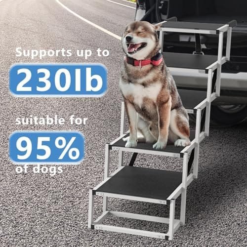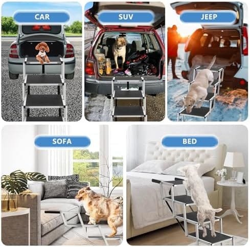 - SUPERIOR DESIGN DOG RAMP FOR CAR: Our Dog Stairs for Large Dogs feature an extra-wide and stable stairway, reducing pressure on your furry friend’s legs. Designed to be gentler on joints and prevent injuries, these stairs are ideal for short-legged, elderly, disabled, or injured dogs.