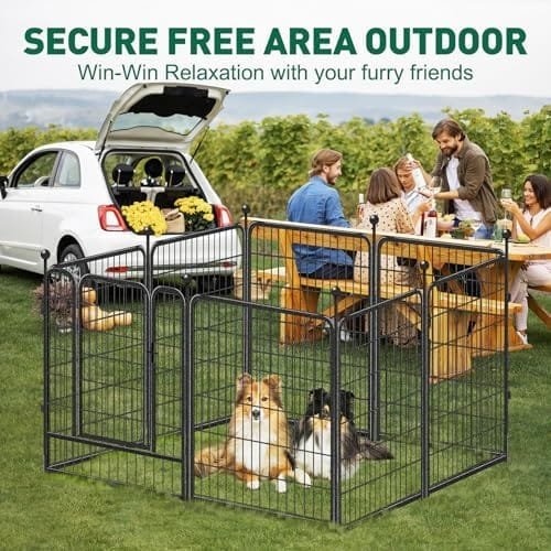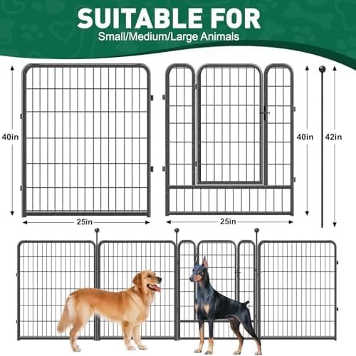 - 🐶 【Pet Safety Space】Our dog fence has a panel size of 25”Wx40”H, consisting of 7 fences and 1 fences with door, which can be formed into different shapes, such as octagonal, square, and rectangular. It is very suitable for small, medium, and large animals to use, The height of 40 ”H is sufficient for safety,provide them with sufficient living and playing space.