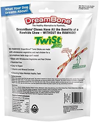 DreamBone® chews have all the benefits of a rawhide chew…without the rawhide! No-rawhide DreamBone chews are made with real chicken, beef, bacon and cheese or sweet potato and wholesome vegetables for a scrumptious taste dogs can’t resist! No-rawhide DreamBone® Twist Sticks for dogs are made with real chicken and wholesome vegetables for a scrumptious taste dogs can’t resist! They have all the benefits of a rawhide chew – without the rawhide! These easy-to-digest chews are enriched with vitamins and minerals in a twist-shaped chew for all sizes of dog. They’re highly digestible and 100 percent delicious. DreamBone Twist Sticks help maintain healthy teeth and gums through the natural action of chewing, making them chews both you and your dog can love! Give your dog one to two DreamBone Twist Sticks chews per day. For supervised consumption only. This product is intended for intermittent or supplemental feeding only. Store in a cool, dry place. After opening this resealable bag, reseal or store in an airtight container to preserve freshness.