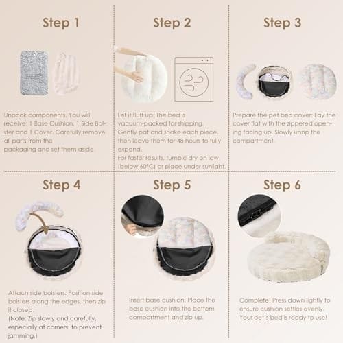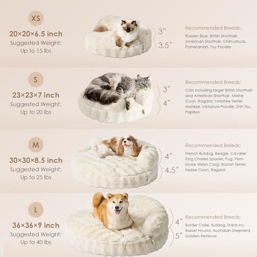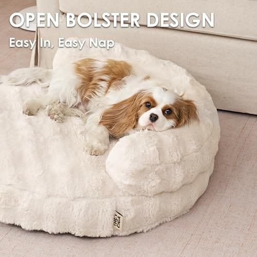 About this item LUXURIOUS FAUX RABBIT FUR: Pamper your pet with the softest faux rabbit fur in a bubble-textured design. This fluffy kitten bed feels cozy and looks elegant, turning any space into a pet sanctuary. PERFECTLY ROUND DESIGN FOR CURLING UP: The round shape cradles your cat or small puppy dog in ultimate comfort, providing support for the body and head while keeping them feeling safe and cozy. WATERPROOF FOR PEACE OF MIND: Designed with a TPU waterproof layer, our pet sofa ensures your furry friend can enjoy their bed worry-free, protecting from accidents and maintaining a clean, dry space. EASY TO CLEAN AND MAINTAIN: The fabric cover is removable and machine washable for easy cleaning. Simply unzip, remove the inserts, and machine wash, keeping your dog couch fresh and hygienic effortlessly. NON-SLIP BASE FOR ADDED SAFETY: With a non-slip dotted bottom, this puppy bed stays securely in place on smooth floors. It provides a safe resting place for your pet no matter how excited they may be. QUICK FLUFF & RECOVERY: This dog bed for small dogs is vacuum-packed for shipping. After opening, simply pat, shake, and let it sit for 48 hours to fully fluff up. For quicker results, tumble dry on low (under 60°C), or leave it in the sun.