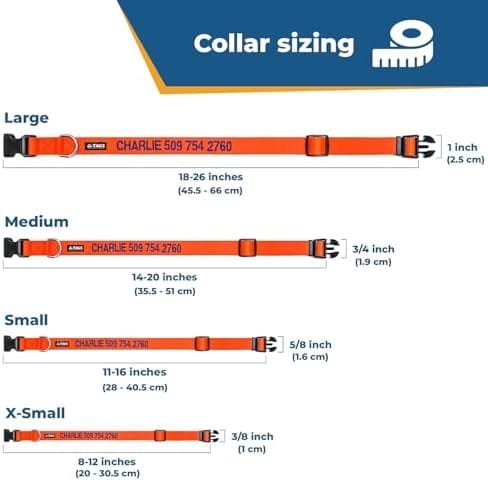 FeatureUnmatched Comfort: Our adjustable, user-friendly dog collar fits all breeds of all sizes. Available in 4 sizes: X-Small (3/8 in. x 8-12 in. length); Small (5/8 in. x 11-16 in. length); Medium (3/4 in. x 14-20 in. length); and Large (1 in. x 18-26 in. length)