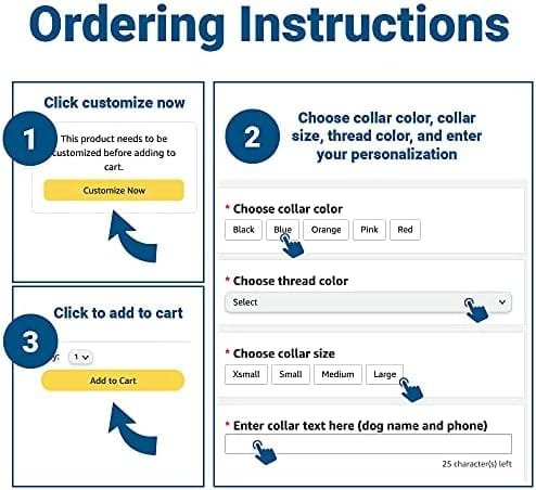 About this item Personalization that WOWs: Give your four legged companion the VIP treatment they deserve with our exclusive custom dog collar. With endless possibilities for personalization, you can create a one-of-a-kind collar that reflects their unique personality Peace of Mind: Don’t let your furry friend’s identity go unnoticed. Our custom embroidered dog collar is a surefire way to keep them safe and stylish. No more fumbling with noisy tags or worrying about them going missing. It’s time to upgrade to a collar that screams “I am loved and protected” Click Customize Now: With a variety of vibrant collar colors and thread options, get ready to steal the spotlight and become the envy of dog owners everywhere Unmatched Comfort: Our adjustable, user-friendly dog collar fits all breeds of all sizes. Available in 4 sizes: X-Small (3/8 in. x 8-12 in. length); Small (5/8 in. x 11-16 in. length); Medium (3/4 in. x 14-20 in. length); and Large (1 in. x 18-26 in. length) Lifetime Durability: Crafted from premium-grade nylon ensuring durability and longevity. No more worries about fraying or wear and tear as our collar is designed to withstand even the most active adventures