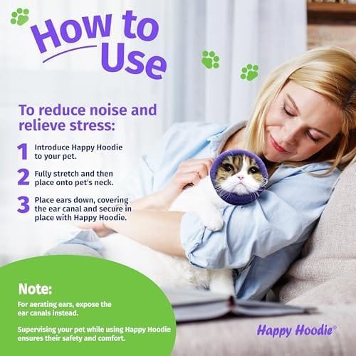 FeatureHOW TO REDUCE NOISE. It is important to place the ears DOWN over the ear canals so the ear canals are NOT exposed, then secure them in place w/ Happy Hoodie. Noise reduction is achieved by Happy Hoodie’s gentle compression closing off the ear canal. IF YOU THINK IT’S TOO TIGHT, PLEASE KNOW SNUGNESS IS NECESSARY. IF YOUR 4 FINGERS FIT UNDER IT, IT’S NOT TOO TIGHT (IT’S SO STRETCHY!). Pets appreciate it most when used ONLY during a stressful situation. PLEASE REFER TO SIZE GUIDE BEFORE PURCHASE.