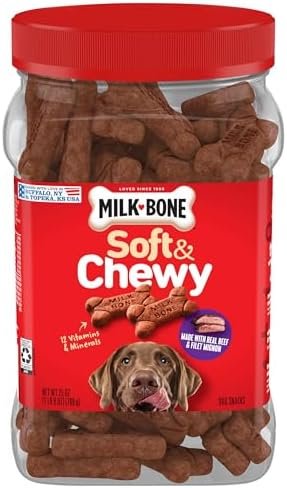 - Contains one (1) 25-ounce container of Milk-Bone Soft & Chewy Beef & Filet Mignon Recipe With Chuck Roast dog treats