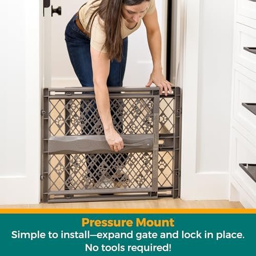 - [Worry-Free Safety]: Our expandable dog gate is great for doorways and blocking off other indoor spaces to keep your pet safe and secure. This durable puppy gate is made of strong, appealing fieldstone gray plastic with adorable paw print accents.