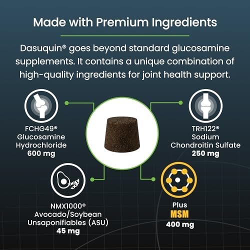 Feature | Better Together with ASU – Dasuquin goes beyond standard glucosamine supplements with avocado/soybean unsaponifiables (ASU), a unique ingredient that works synergistically with glucosamine and chondroitin to help support healthy joints and cartilage. |
