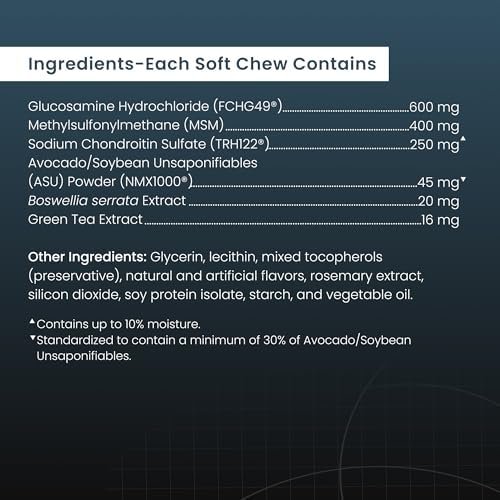 - Patented Formula – With a unique combination that contains glucosamine hydrochloride (FCHG49), sodium chondroitin sulfate (TRH122), ASU (NMX1000), methylsulfonylmethane (MSM), Boswellia serrata extract, and green tea extract, Dasuquin helps support your dog’s joint health.