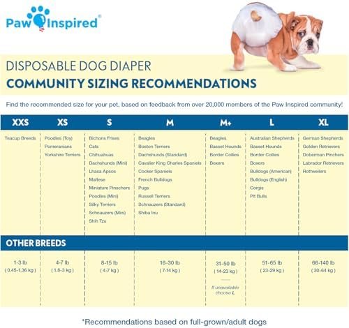 About this item – BEST DOG DIAPERS on the market, please check the sizing chart in the product images section to assure suitable sizing so diapers stay on and stay put. – LEAK PROOF dog diapers, super absorbent core, comfortable, secure fit, breathable bottom layers, and gathered leak proof edges. – DISPOSABLE dog diapers with repositionable fur resistant fasteners and Advanced DrySpeed Technology that instantly converts urine into gel. – MANY USES and applications: from puppy diapers, adult dog diapers, to dog diapers for older dogs these Dog diapers help with issues like training, incontinence, and period – menstrual Hygiene. Also can be used as pet diapers for other pets including use as cat diapers. – BEST FOR FEMALE – girl dogs and urinary incontinence. If you measure your pet properly and choose the corresponding size, these diapers will fit many dog breeds including challenging body shapes like Dachshunds, Yorkies, Pugs, French Bulldogs, Bulldogs, Tailless Breeds, and many other Dog Diaper Houdinis. If your dog is still a professional Dog Diaper Houdini you can check out our Paw Inspired Dog Diaper Suspenders which will assure your diapers stay on and stay put.