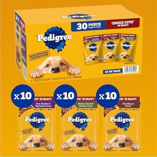 Dogs bring out the good in us. Pedigree brings out the good in them. Express your love for your dog by serving Pedigree Choice Cuts In Gravy Adult Soft Wet Dog Food Variety Pack. These great-tasting wet dog food recipes are 100% complete and balanced For Adult Dogs and are made with real beef or real chicken, bringing a filling and familiar flavor to mealtime. Pedigree Choice Cuts In Gravy Adult Soft Wet Dog Food Variety Pack features three delicious flavors: Hickory Smoked Chicken Flavor, Filet Mignon Flavor, and Beef, Noodles & Vegetables Flavor so your dog can have favorites to choose from. This versatile soft dog food can be served as a topper, mixed with dry dog food, or enjoyed by itself as a complete meal For Adult Dogs, bringing your dog a variety of ways to indulge. Crafted with no high fructose corn syrup, artificial flavors, or added sugars although, trace amounts may be present due to potential cross-contact at manufacturing, Pedigree Choice Cuts In Gravy Adult Soft Wet Dog Food Variety Pack shows your dog that you care and have great taste.