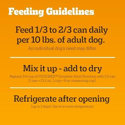 Directions | Both Daily Feeding Guide:*: Feed 1/3 to 2/3 can daily per 10 lbs. of adult dog. *An individual dog’s needs may differ. Mix it up – add in dry: Replace 3/4 cup of Pedigree Complete Adult Nutrition with 1/2 can (1 can = 13.2 oz., 1 cup = 8 oz. measuring cup). Refrigerate after opening (up to 3 days). Serve at room temperature. |