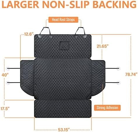 Feature | 【Non-Slip Net & Overall Protection】 Extra large textured 53.15″ x 40″ anti-slip rubber backing (twice as much as the average product) for more stability, no worries about quick turns and speed bumps; 2 Suction cups and 3 Strong Velcro on both sides for fixing the side panels on the car to avoid sliding left and right, keeping a safe car environment. NOTES: Suction cups will be more sticky with little water |