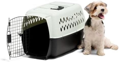 About this item FASHION MEETS FUNCTION: Protect your pet and home with the Pet Porter Fashion Dog Kennel. The easy-open latch secures the sturdy wire door, while the fold-down handle makes carrying a breeze, combining convenience with safety. AIRLINE-FRIENDLY: Our dog carrier meets most airline cargo specifications and features ventilation on 4 sides for fresh air and visibility, helping your pet stay comfortable. Plus, the built-in storage keeps essentials like identification or treats close for added peace of mind. TRAVEL CRATE FOR SMALL DOGS: With interior dimensions of 21.5″ L x 15″ W x 13.5″ H, our carrier is ideal for breeds weighing 15-20 lbs. No tools required for assembly. Pets should have just enough room to walk inside the dog kennel, turn around, and lie comfortably. EASY TO KEEP CLEAN: Designed with a sturdy plastic shell, this puppy carrier is easy to wipe down quickly. The interior stay-dry moat directs fluids away from your pet in case of accidents, making it ideal for housebreaking puppies or keeping pets dry during travel. PETMATE: The well-being of pets is at the heart of everything we do. For over 60 years, we’ve been dedicated to creating reliable, high-quality products that improve the lives of pets and their owners, knowing that pets are every bit as much a part of the family.
