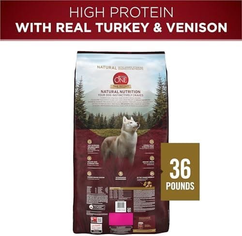 About this item Real turkey is the number 1 ingredient in this dog food with venison to help deliver 30 percent protein that helps support strong muscles, including a healthy heart Natural dog food with added vitamins, minerals and nutrients and with no poultry by-product meal or artificial flavors or preservatives High protein dog food with 100 percent nutrition for adult dogs, 0 percent fillers. Every ingredient has a purpose Premium dog food with omega-6 fatty acids to help support his healthy skin and radiant coat and with four antioxidant sources to support a strong immune system Complete and balanced dog food kibble for adult dogs crafted by a veterinarian recommended brand in Purina-owned, U.S. facilities