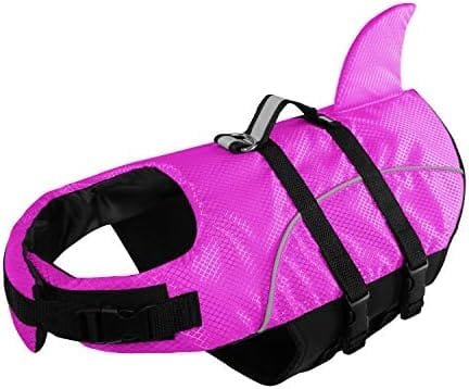 About this item HIGH BUOYANCY FABRICS – Made of high quality professional floating polyester and advanced breathable mesh underbelly to keep good floation and proper draining and drying. CUTE SHARK FIN STYLE – Adjustable nylon straps, quick release buckles, high quality comfortable magic sticker fastening system around the belly and neck to keep securely fastened. RESCUE HANDLE AT BACK – A strudy and low profile nylon handle at the back to pick your dog up in emergency cases. A D-ring hook is also added for leash use to keep the dog close to you. EASY TO SPOT YOUR DOG – The life jacket has reflective accents and the bright color to help enhance visibility of your dog. LIGHTWEIGHT BUT STURDY – LIGHTWEIGHT BUT STURDY – Best dog life jackets can keeps your small and medium breed dogs always afloat above the water when he/she is boating, canoeing, surfing, swimming.