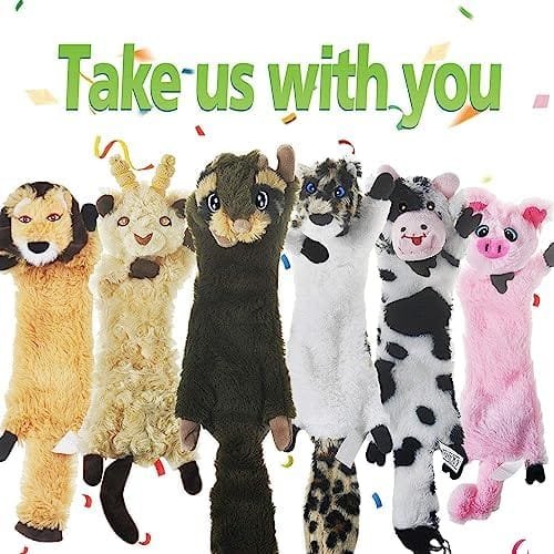 Material: Floppy plush Size: Chipmunk Dog Toy: 16.92height x 3.94 width Pig Dog Toy: 15height x 3.94 width Cow Dog Toy: 17.72height x 3.54 width Lion Dog Toy: 15height x 3.54 width Lamb Dog Toy: 14.1height x 3.94 width Leopard Dog Toy: 17.72height x 3.54 width Fun and cute shape 6 pack dog toys make them easy for dogs of all breeds and size to carry, play with and snuggle, they are perfect gifts for your lovely dogs to kill bored time. Great value for the amount of toys you get. Dogs are obsessed with these plush dog toys. Ideal dog toys for small dogs, but large and medium pups love our unstuffed dog toys just as much; Their floppy light weight bodies make these plush dog toys easy for small dogs to carry, toss, and roll around with. Crinkle paper and squeakers all over the body make dogs wont just focus on one to rip apart. They’re actually lasting longer than her other soft toys. These toys are made of 100% non-toxic material, very safe for your furry friends. Hand-embroidered eyes and no stuffing design can prevent the dogs from swallowing. Its suitable for dog chewing and cleaning. Not for aggressive chewers. Because our dogs are enjoy ripping everything apart, all proud like they killed it, we recommend supervised play, and timely * of the broken ones. Due to manual measurements, please allow slight different in sizes.