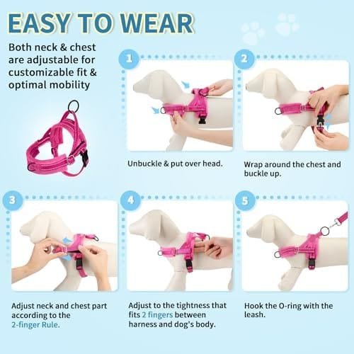 | Feature | Easy On & Lightweight — Instead of step-in way, this halter harness is easy stress free put on through dog’s head. The only 1 snap buckle on the tummy part make the applying and removing in seconds. Very light weight material adopted, even the back metal D ring, make small dogs feel ease when walking. |