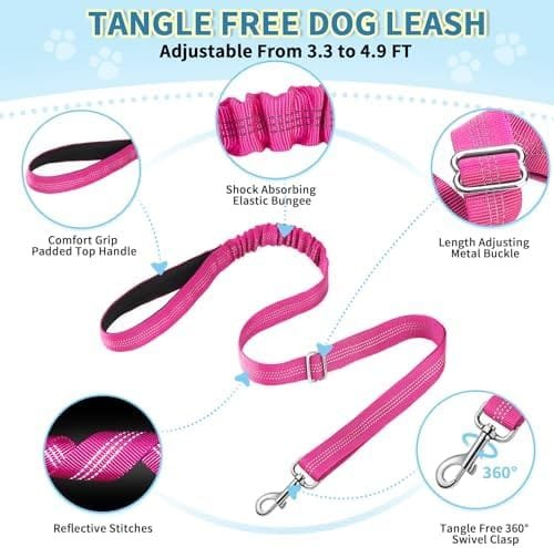 - Tangle-free Leash & Reflective — The heavy-duty 360°swivel metal hook ensures no tangle. And the dog lead is length adjustable from 3.3 to 4.9 ft, plus the elastic bungee and padded handle, great for walking training of city dogs, or wonder off in country. The reflective stitching on the straps enhanced the visibility in the dark.