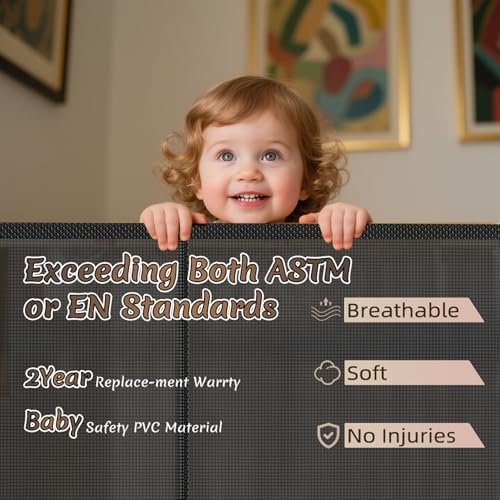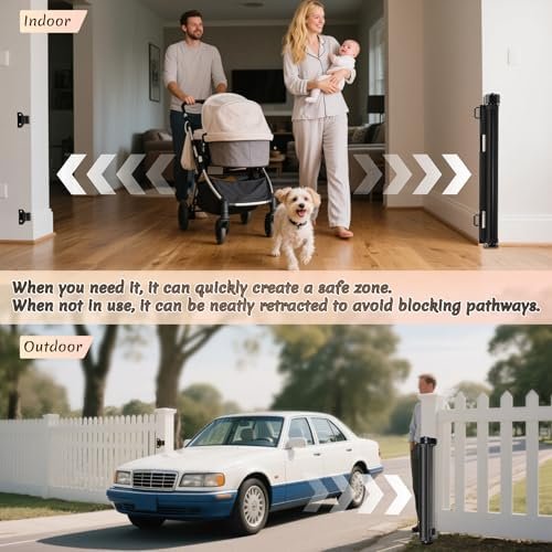 - 【Upgraded Retractable Gates】Miumoon retractable baby gates features an innovative fiber bar design that enhances stability, preventing top and bottom mesh deformation. This eliminates the risk of children or pets crawling or squeezing through the gate. The fiber rod design ensures an exceptionally smooth retraction experience.