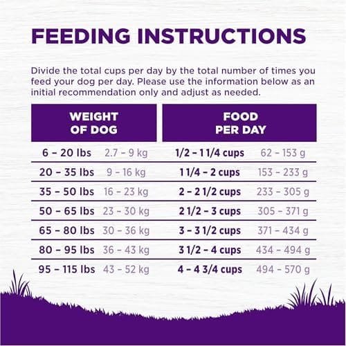 Directions | WEIGHT OF DOG(LBS) WEIGHT OF DOG(KG) CUPS/DAY GRAMS/DAY 7 – 17 3 – 7 ½ – 1 60 – 120 18 – 23 8 – 10 1 – 1 ⅓ 120 – 160 24 – 45 11 – 20 1 ½ – 2 ⅓ 180 – 280 46 – 65 21 – 29 2 ⅓ – 3 280 – 360 66 – 85 30 – 38 3 ¼ – 3 ¾ 390 – 450 86 – 105 39 – 47 3 ¾ – 4 ½ 450 – 540 106 – 125 48 – 57 4 ½ – 5 540 – 600 |