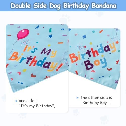 | Feature | Double Sided Design:The birthday bandana for dogs are double sided, one side has a cute print of “It’s my Birthday,” and the other side has a sweet print of “Birthday Boy.” Ease of use |