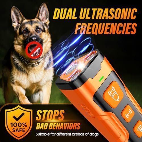 - Stronger Bark Control with 3X Ultrasonic Emitters: Unlike single-emitter devices, our upgraded dog bark deterrent —delivering 3X the coverage to quickly stop barking, biting, and jumping behaviors. Ideal for anti barking training, safer than bark collar, more effective than a dog whistle. Offers a humane dog training solution for 97% dogs from 6 months to 8 years without hearing impairments, and Not recommended for dogs with known neurological disorders like epilepsy or seizures.
